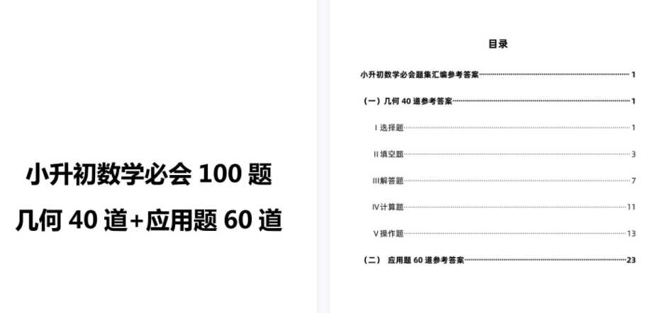 无论小升初还是各类数学竞赛,都会有几何题和应用是的出现,本文列举了100题。欢迎下载:小升初数学必会100题(几何40+应用60)参考答案