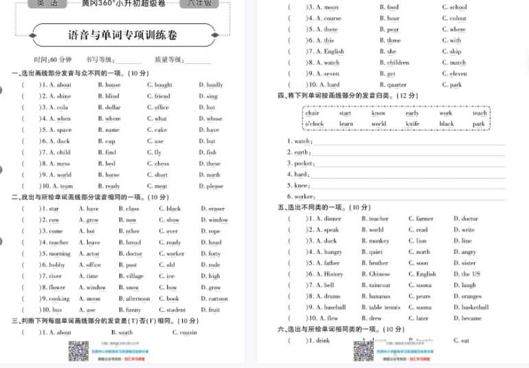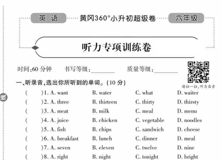 小升初英语卷,专项练习,抓住最后的一年时间,让孩子们查缺补漏,欢迎下载:黄冈360小升初英语卷【96页PDF文档】百度网盘下载