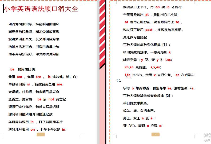 小学正是英语学习打下基础阶段,小编精心整理了小学语法大全,各位宝爸宝妈可以与家里的小宝贝共同学习。欢迎下载:小学英语语法顺口溜大全