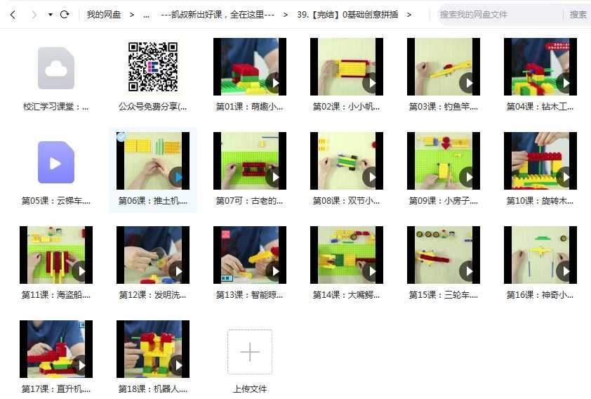 幼小阶段孩子的智能的开发非常重要,通过积木的各种拼插组合,刺激和训练孩子的大脑,是目前比较有效的方法,今天来给孩子带来:凯叔出品幼小阶段《零基础创意积木拼插》智能开发视频课18课全,MP4视频百度网盘下载,儿童头脑开发视频。