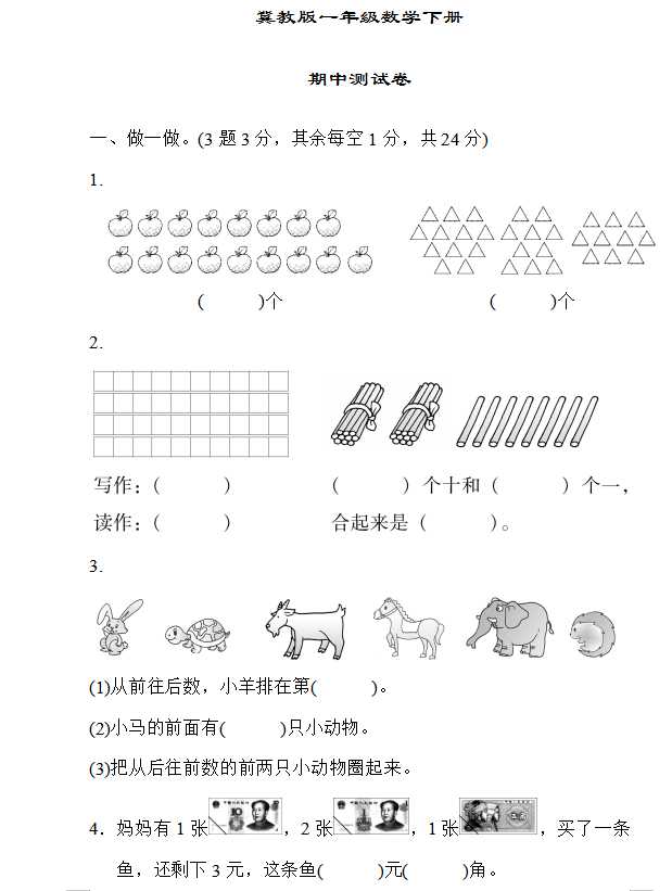 当前位置: 首页一年级一年级数学正文 冀教版小学一年级数学下册《期中测试卷》(附答案)(8页DOC文档)资料下载 声明:本站所有文章,如无特殊说明或标注,均为本站原创发布。任何个人或组织,在未征得本站同意时,禁止复制、盗用、采集、发布本站内容到任何网站、书籍等各类媒体平台。如若本站内容侵犯了原著者的合法权益,可联系我们进行处理。一年级数学数学文档 admin永久会员 打赏 收藏 海报 链接
