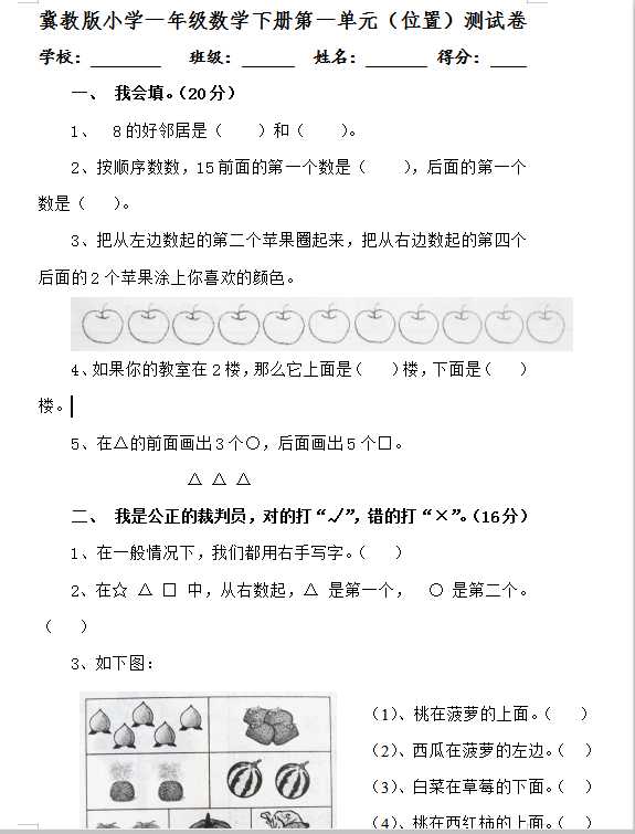 冀教版小学一年级数学下册位置测试卷(5页DOC文档)资料下载