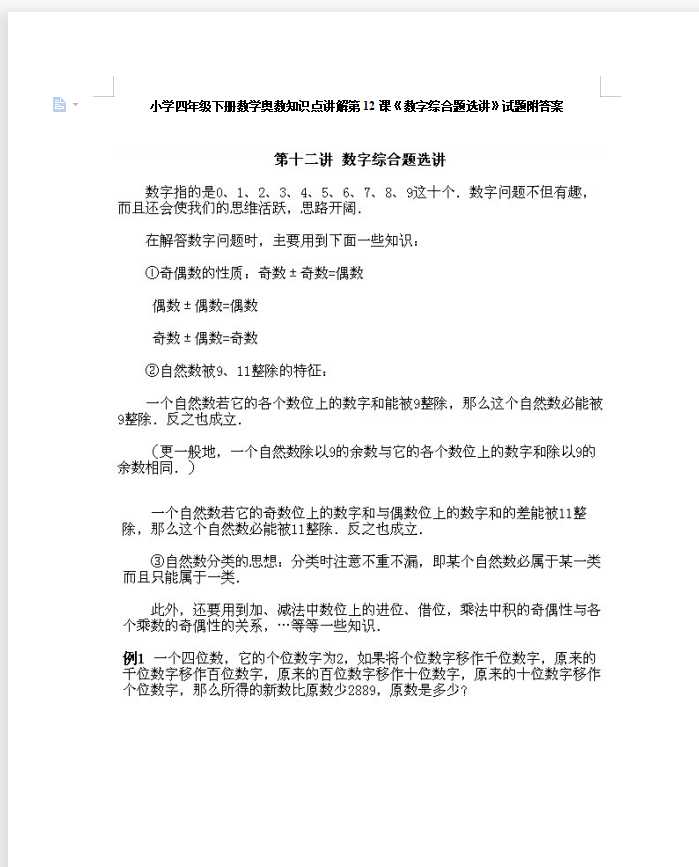 当前位置: 首页四年级四年级奥数正文 小学四年级下册数学奥数知识点讲解第12课《数字综合题选讲》试题附答案(DOC文档11页电子档下载) 声明:本站所有文章,如无特殊说明或标注,均为本站原创发布。任何个人或组织,在未征得本站同意时,禁止复制、盗用、采集、发布本站内容到任何网站、书籍等各类媒体平台。如若本站内容侵犯了原著者的合法权益,可联系我们进行处理。四年级奥数四年级数学 admin永久会员 打赏 收藏 海报 链接